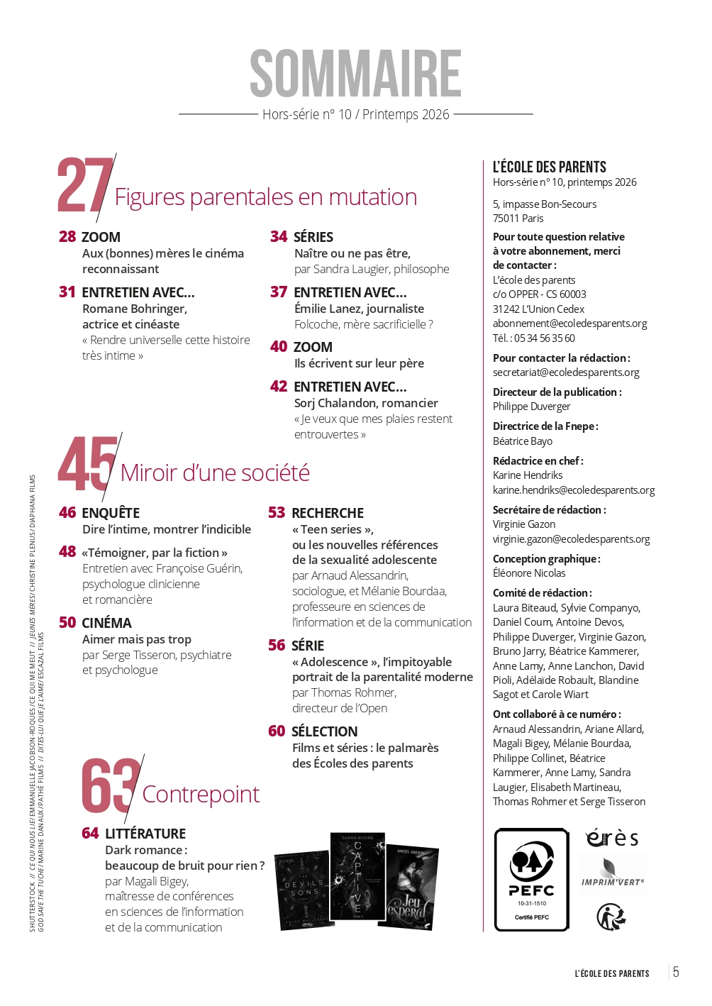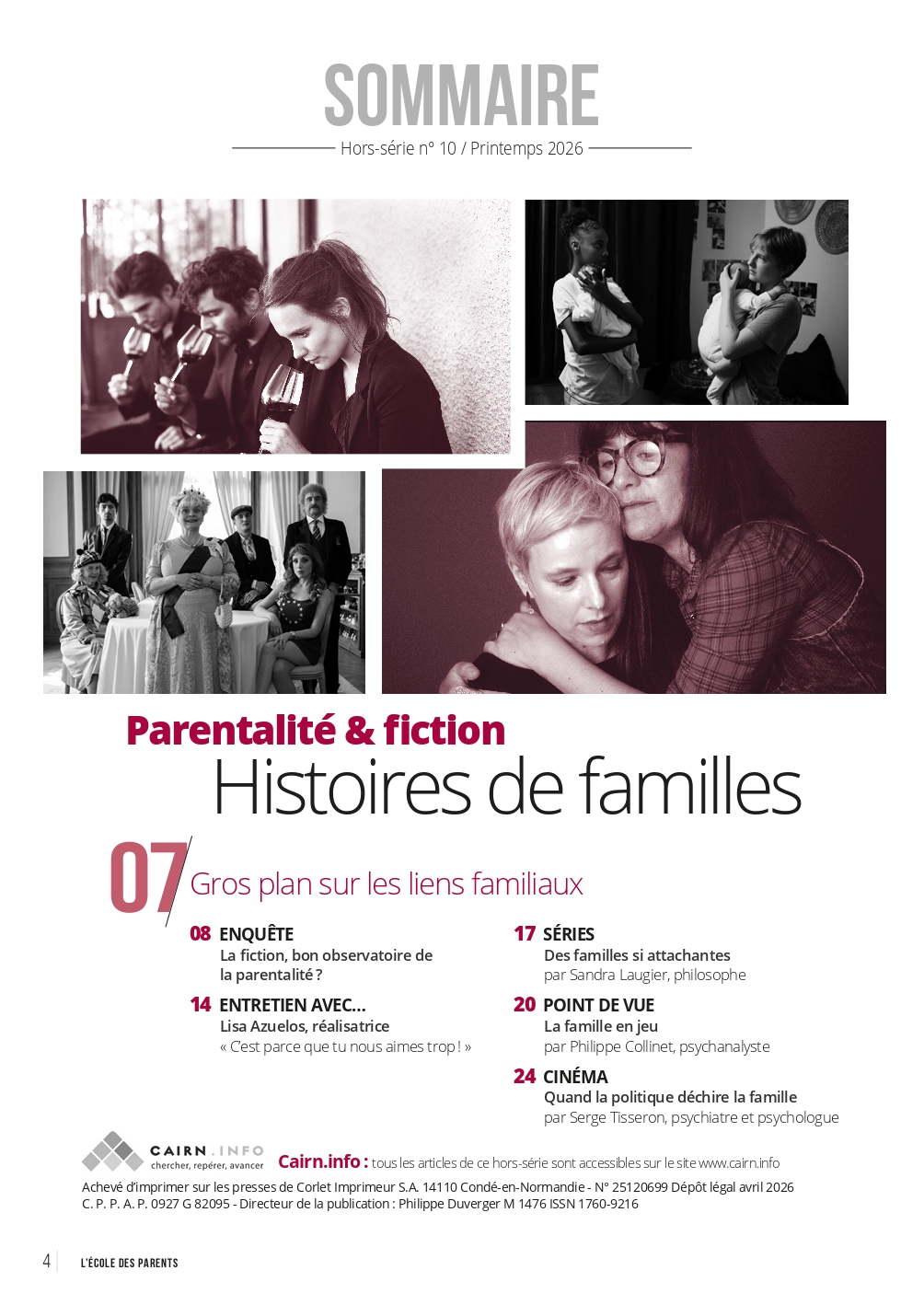 De Kramer contre Kramer à This Is Us, de La Boum à LOL 2, de La Chambre du fils à Adolescence, la famille est une source d’inspiration inépuisable pour la fiction contemporaine. Thème universel, elle irrigue le cinéma, les séries, mais aussi les romans, qui en font depuis plusieurs saisons littéraires un terrain d’exploration privilégié. Tour à tour miroirs et loupes, ces histoires reflètent les mutations de la société autant qu’elles les interrogent. À l’heure où les modèles se diversifient, elles mettent en scène ces nouvelles réalités, auscultent les liens intimes et osent aborder des sujets longtemps restés tabous. Pourquoi ces récits nous touchent-ils autant ? Parce qu’ils nous ressemblent ? Ou parce qu’ils nous permettent d’habiter d’autres vies, d’expérimenter d’autres choix, d’éprouver d’autres possibles ? Que nous disent-ils de nous-mêmes ou de leurs auteurs et autrices ? À travers ces questions, ce hors-série propose un voyage au coeur de ces mille et une vies qui composent finalement un formidable observatoire de la parentalité !