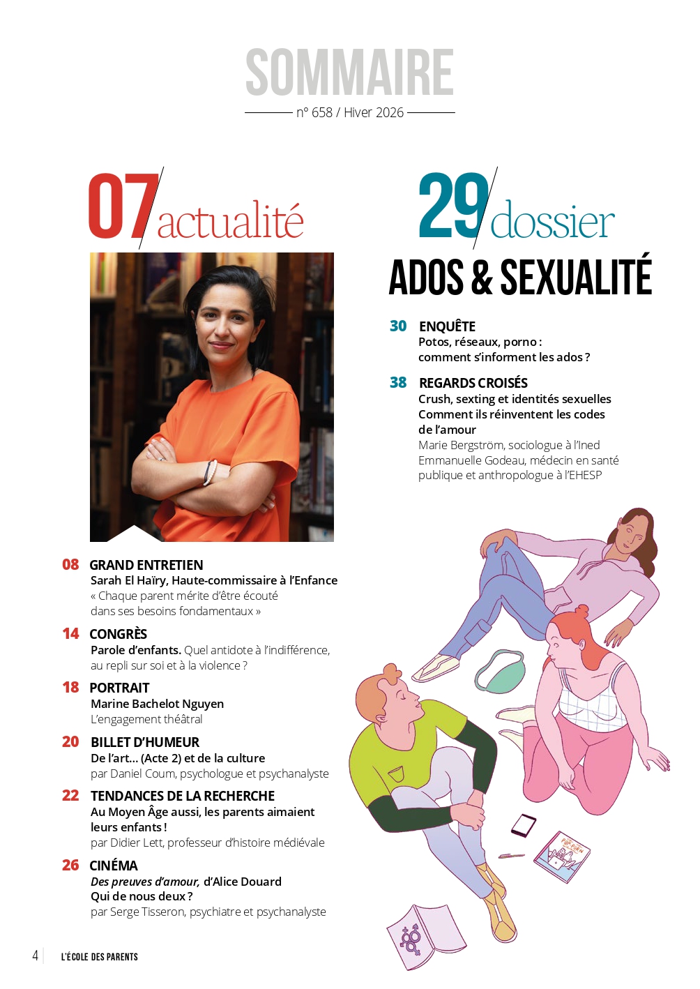 Depuis la rentrée scolaire 2025, l’éducation à la vie affective, relationnelle, et à la sexualité (evars), obligatoire depuis 2001 du primaire au lycée, est dotée pour la première fois d’un programme officiel. L’occasion pour L’école des parents de proposer un nouveau dossier sur la découverte de la sexualité: comment les adolescents s’informent-ils aujourd’hui ? Le porno est-il devenu pour cela une porte d’entrée incontournable ? Comment les pratiques numériques influencent-elles les rencontres amoureuses? Pourquoi l’éducation sexuelle à l’école est-elle un sujet si sensible? Que faut-il enseigner aux enfants selon leur âge ? Ce nouveau numéro tente d’apporter des clés pour comprendre les évolutions en cours, évoquant aussi la révolution #MeToo, la question du consentement, la montée des théories masculinistes et les inquiétudes autour de l’exploitation sexuelle des mineures.